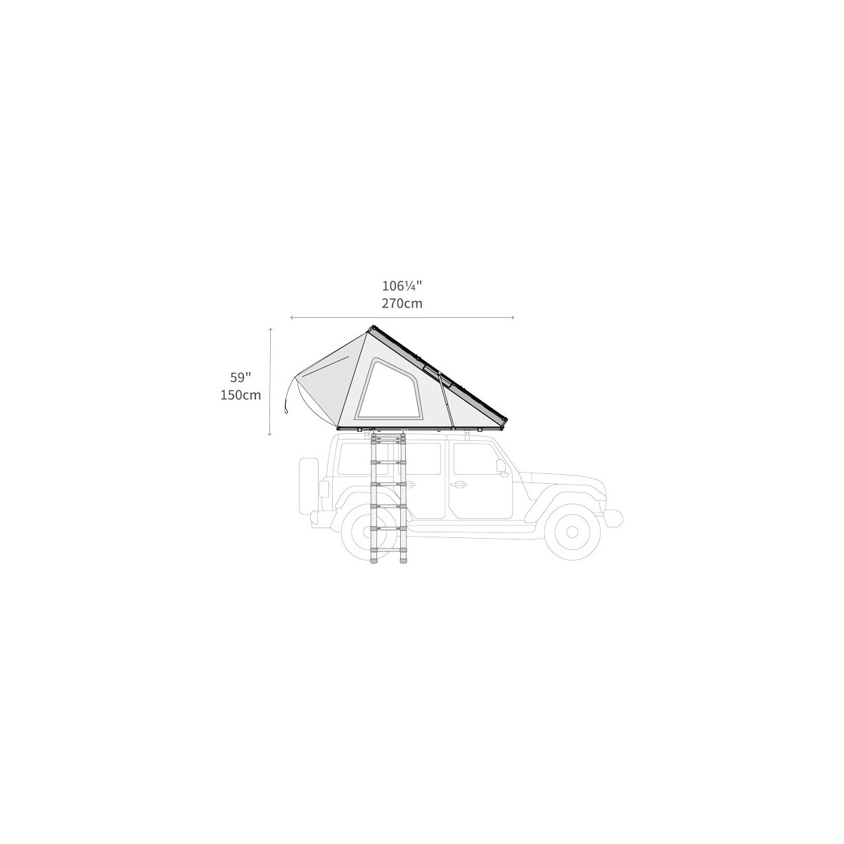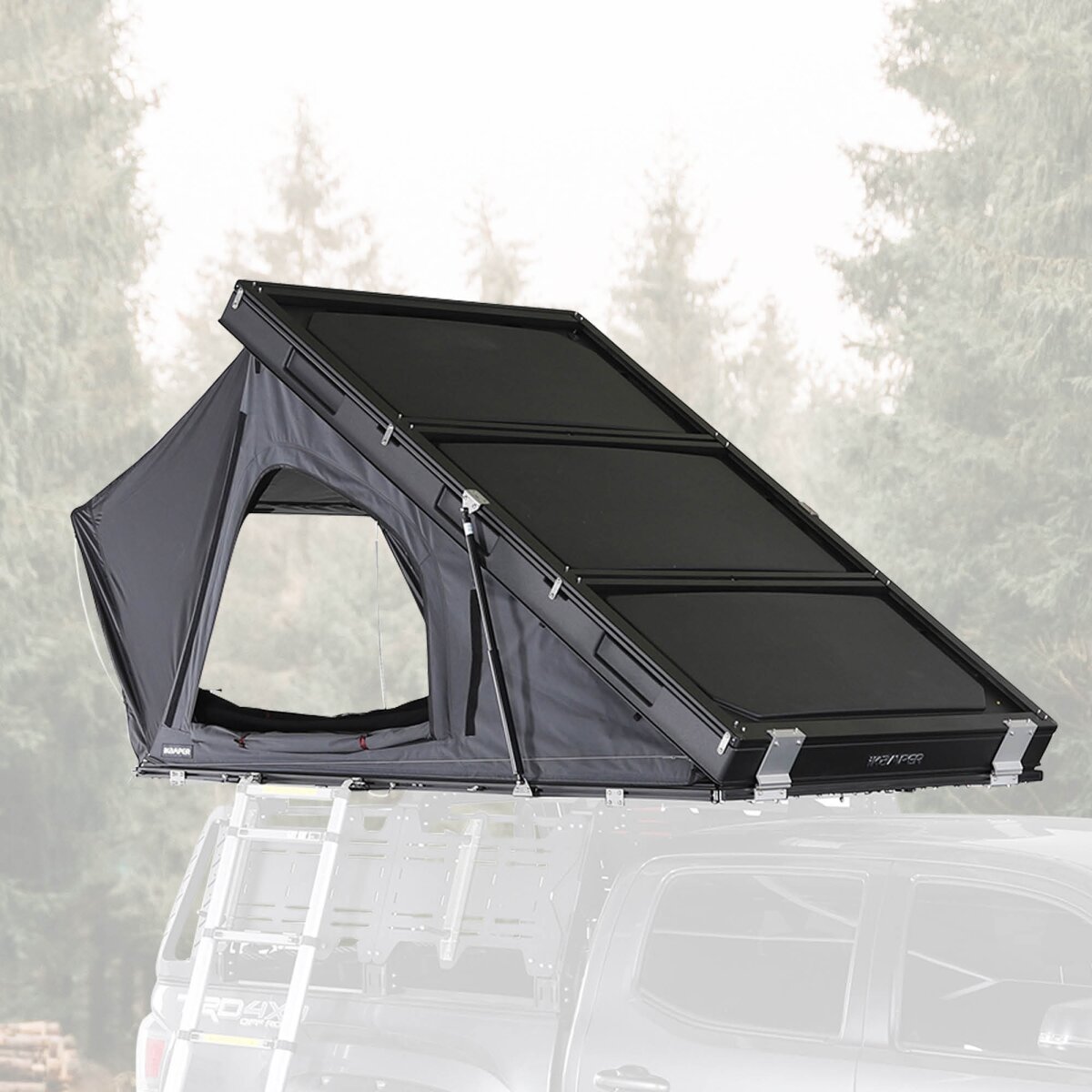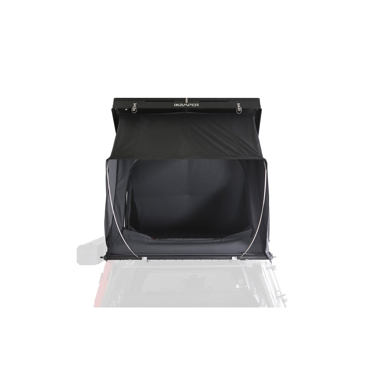 Moreover, the BDV is super flat. When closed, it is only 17 cm high. And unfolding the tent is just as easy and quick as you'd expect. Once both snap fasteners on the hard shell are open, a gentle pressure against the tent cover is enough, and the tent opens automatically in 15 seconds. Then just install the ladder and the door tension rod, and the tent is ready for occupancy.